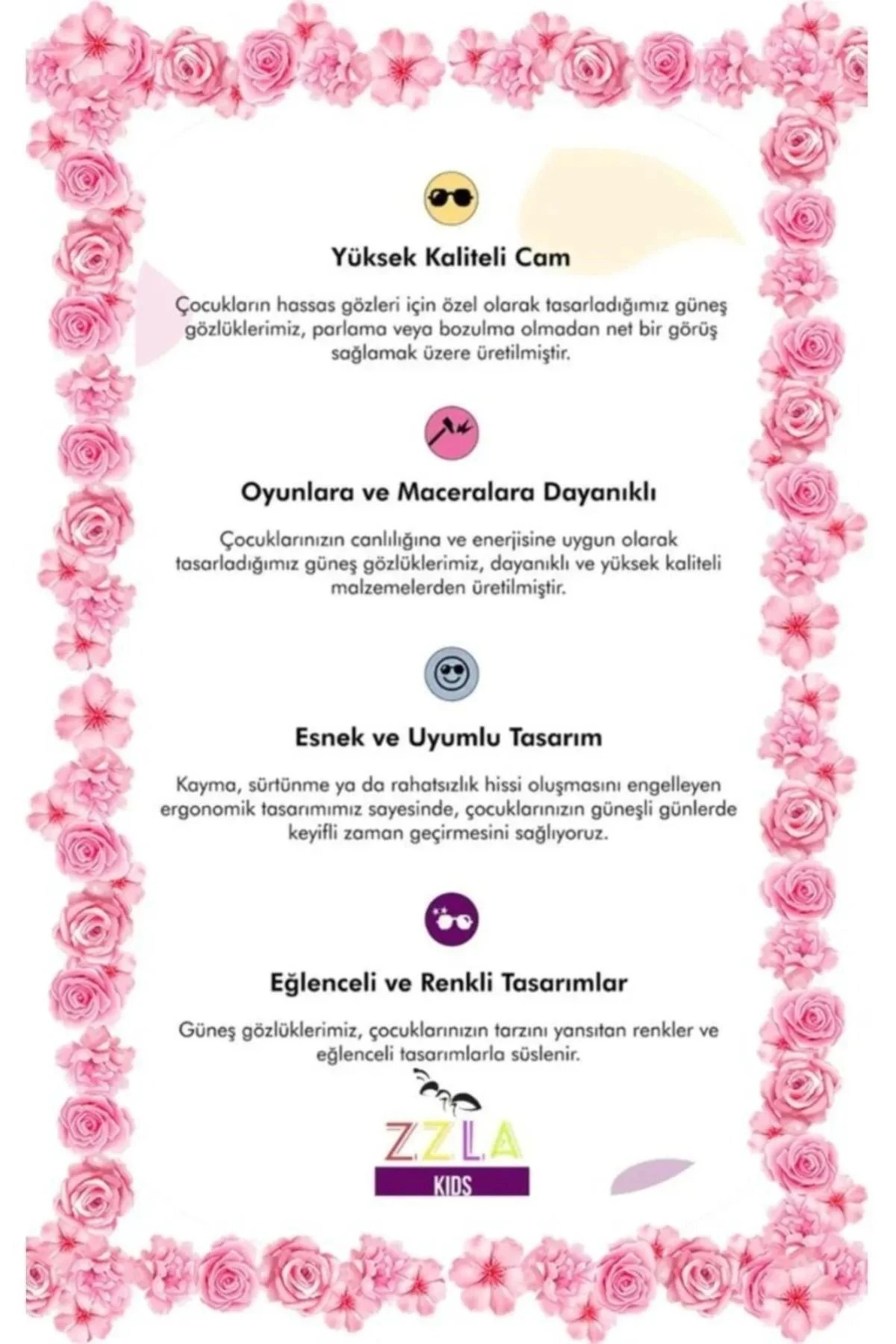 UV400 filtre özelliği sayesinde, çocukların gözlerini zararlı UVA ve UVB ışınlarına karşı korur; Yuvarlak çerçeve formu, klasik ve zamansız bir görünüm sunar; Düz deseniyle sade ve şık bir tasarıma sahiptir, her türlü kıyafetle kolayca uyum sağlar; Kahverengi cam rengi, hem şıklığı hem de konforu bir arada sunarak gözleri rahatlatır; Dayanıklı kemik çerçeve materyali, uzun süreli kullanım için idealdir ve çocukların aktif oyun zamanlarında bile dayanıklılık sağlar; Tam çerçeveli tasarımı ile gözlük yapısı, çocukların yüzlerine tam oturur ve kayma yapmaz; Degrade cam tipi, renk geçişleriyle parlama ve yansımaları azaltarak daha net bir görüş alanı sunar; Bebek ve çocuklar için özel olarak tasarlanmıştır; onların hassas göz sağlığını düşünerek üretilmiştir;
